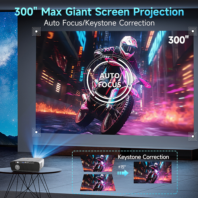 Android systemAndroid 9.0,with wifi(android/IOS cast-Miracast),IOS Wired Screen Mirroring,2G RAM and 16G ROM,3D Stereo Bluetooth speakerLam Type200W LED Lamp